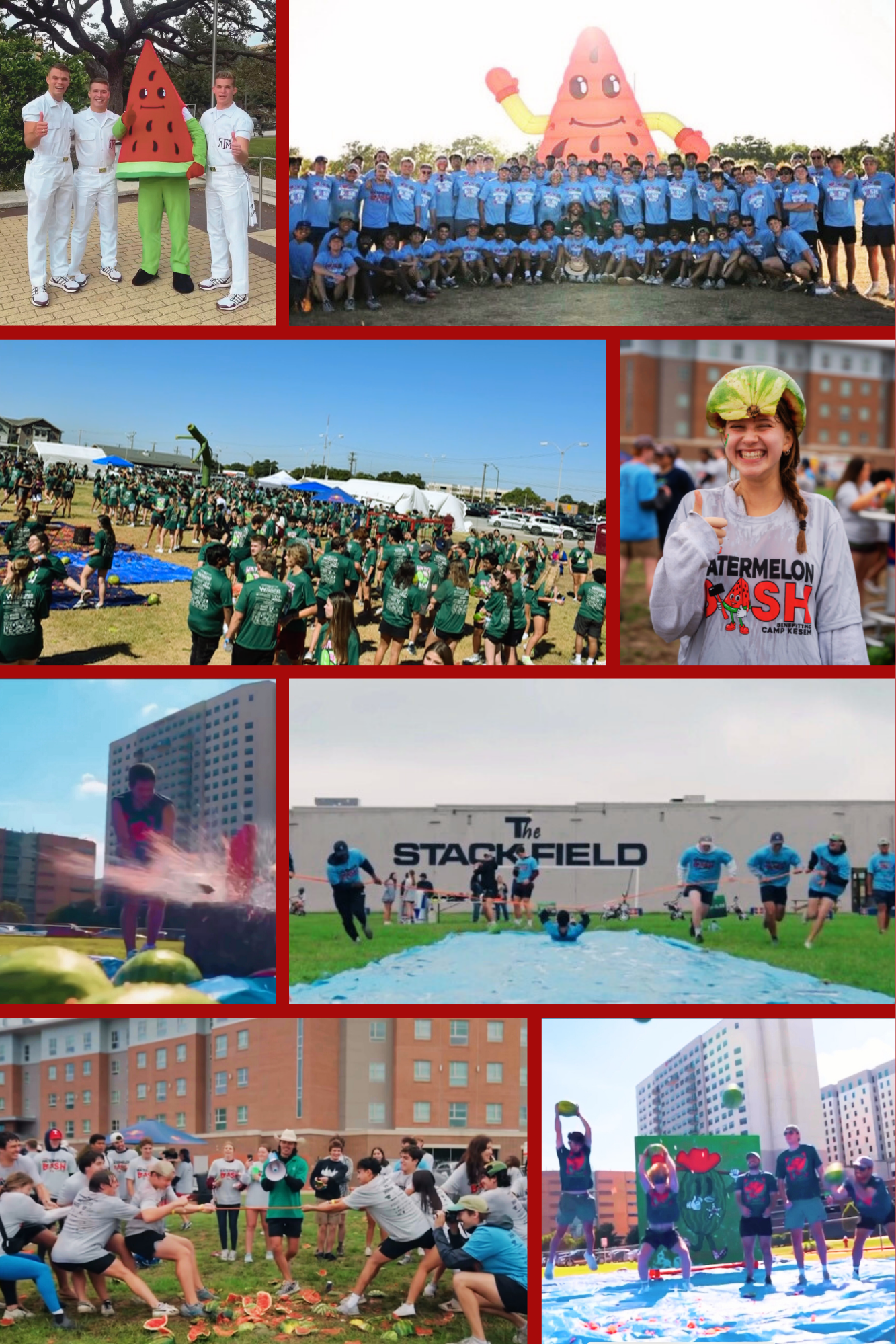 Watermelon Bash, hosted by Century Men’s Society at Texas A&M University, is a watermelon-themed, carnival-style event designed for students and community members to come together for a day of fun and philanthropy. Participants can engage in activities like the Watermelon Smash, Melon Superslide, tug-of-war, and the great Watermelon Toss, along with many other watermelon-themed stations and team competitions.